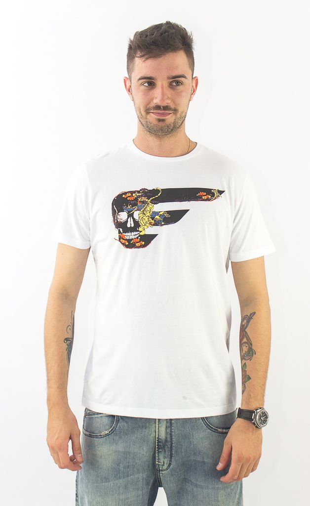 T-shirt confeccionada em malha de algodão com manga curta, gola careca e detalhe em silk localizado na parte frontal.