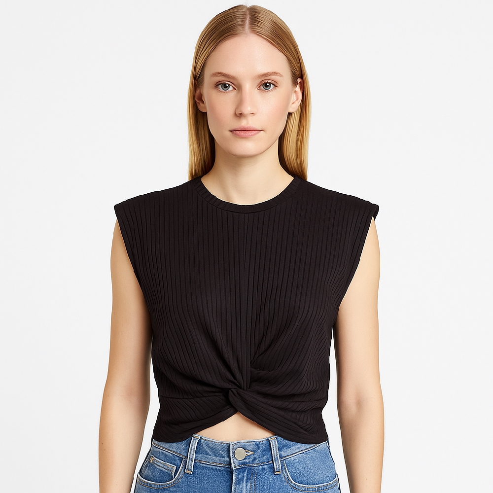 Blusa apresenta shape slim e modelagem ajustada. A peça possui textura canelada, gola alta arredondada, laterais cavadas e aplicação de placa com logo minimalista na parte traseira.