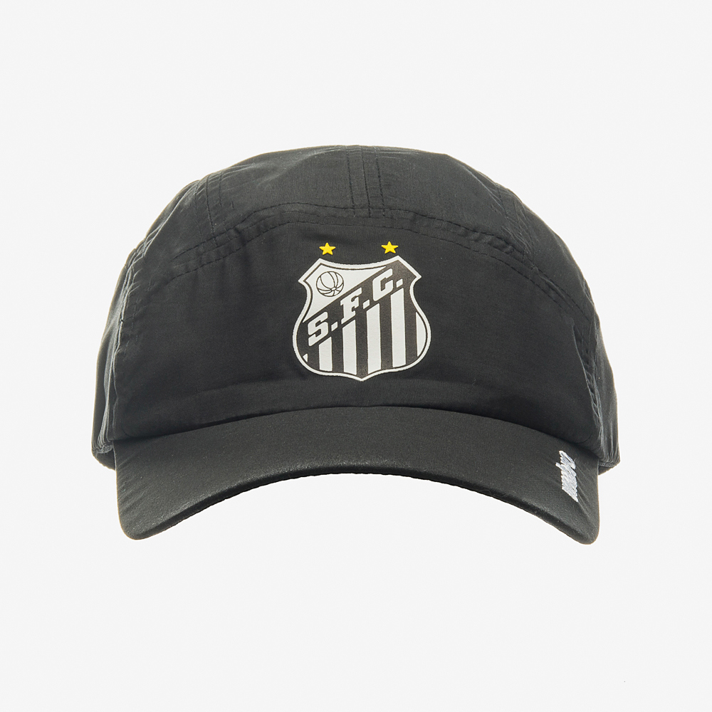 Boné estilo americano, confeccionado em sarja. Possui ajuste com fecho de plástico na parte traseira, escudo do Santos bordado em relevo na mesma cor do boné, logo Umbro em cor contrastante aplicado na parte traseira ao lado do fecho e cobre costuras interno personalizado Umbro.