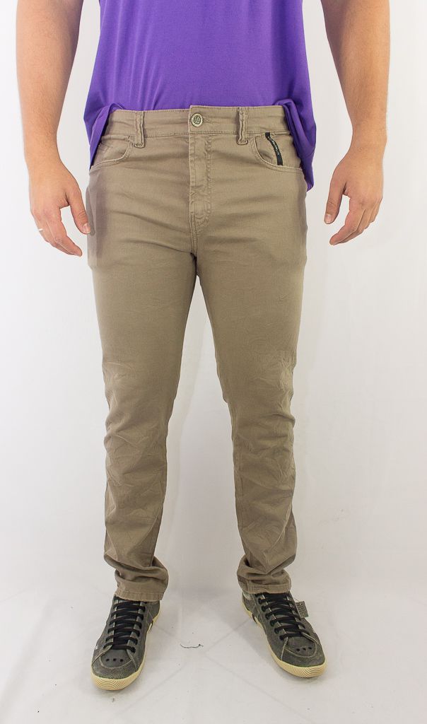 A calça color é confeccionada em sarja. A peça de modelagem slim possui cós com passantes, 5 pockets, aplicação de aviamentos personalizados, tag da marca aplicada e fechamento frontal através de botão e zíper.