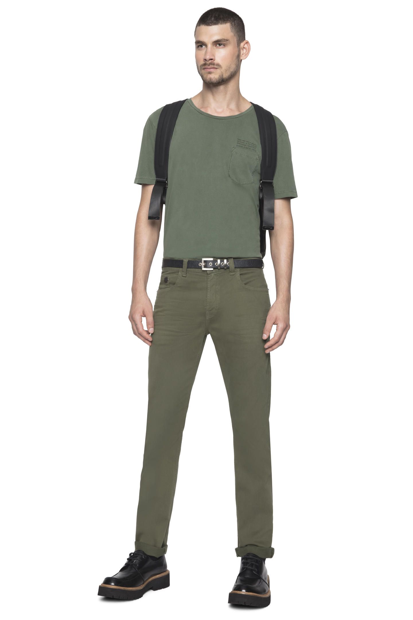 Calça color com modelagem super slim five pockets, efeito bigode amassadinho e aviamentação personalizada.