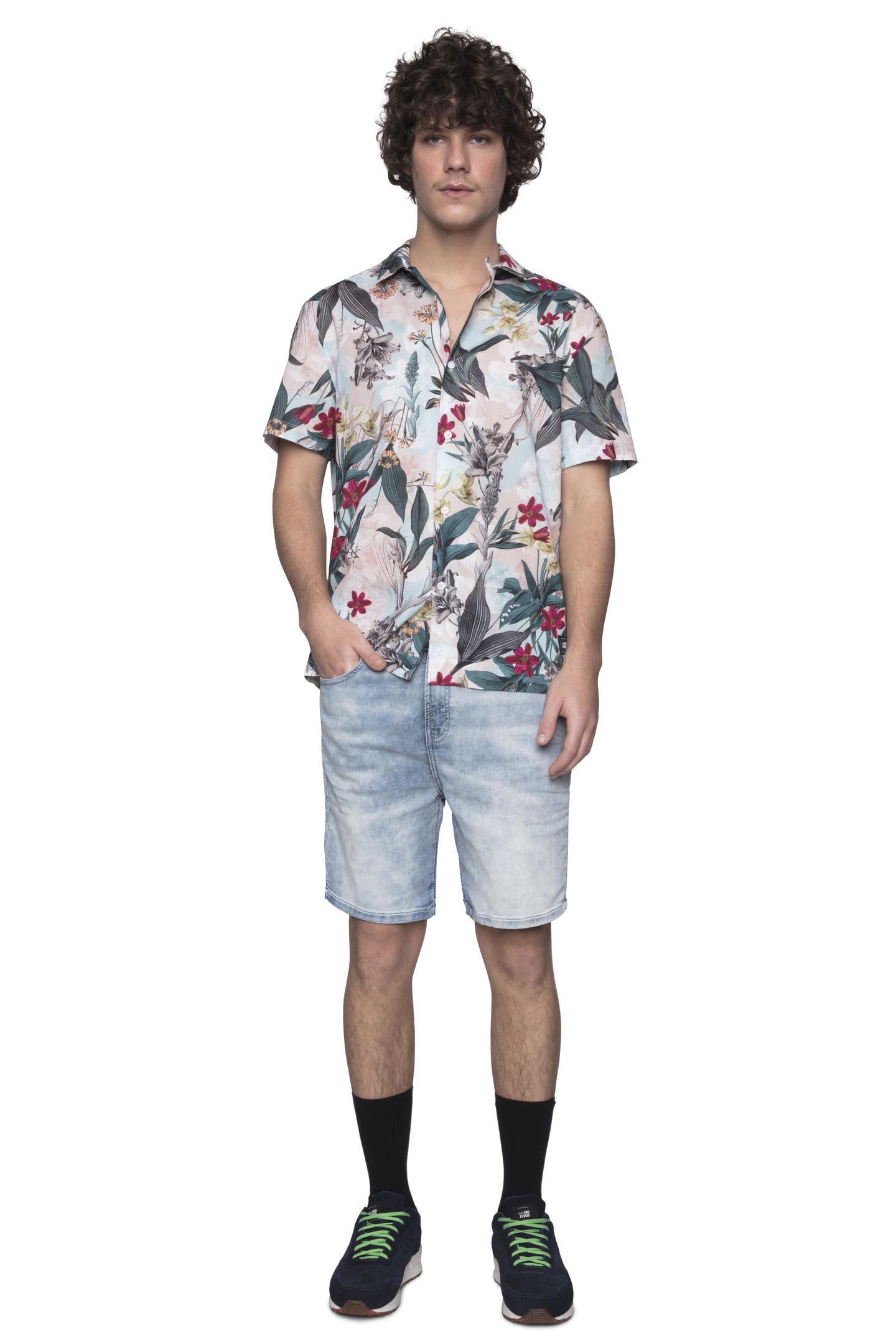 Camisa de manga curta confeccionada em puro algodão estampado com abotoamento clássico frontal em madrepérola.