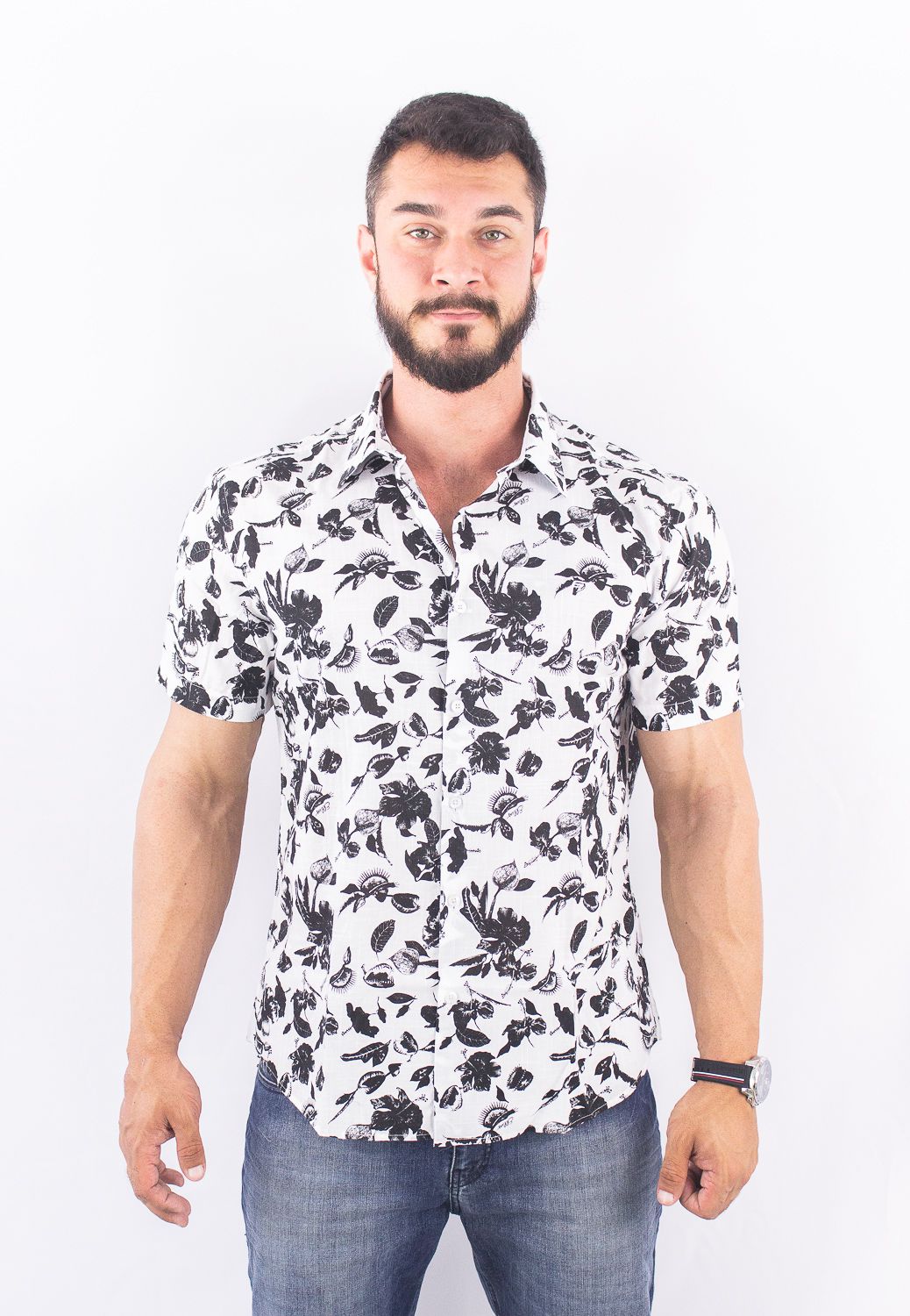Camisa Ellus flytraps floral print, com estampa e folhagens, bordado da marca, modelagem com mangas curtas, gola de pontas e fecho em botões.