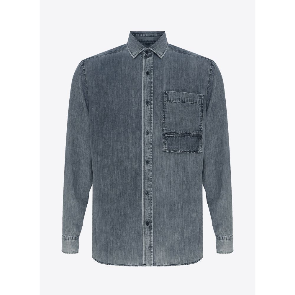 A camisa é confeccionada em algodão, possui modelagem reta, fechamento frontal, gola clássica, mangas longas e acabamento pespontado.