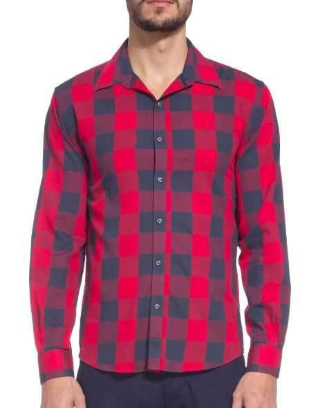 A camisa vermelho é confeccionada em tricoline. A peça com estampaxadrez possui mangas longas com botão nos pulsos, tag da marca na altura do tórax, caimento reto, colarinho americano e fechamento frontal por botões.
