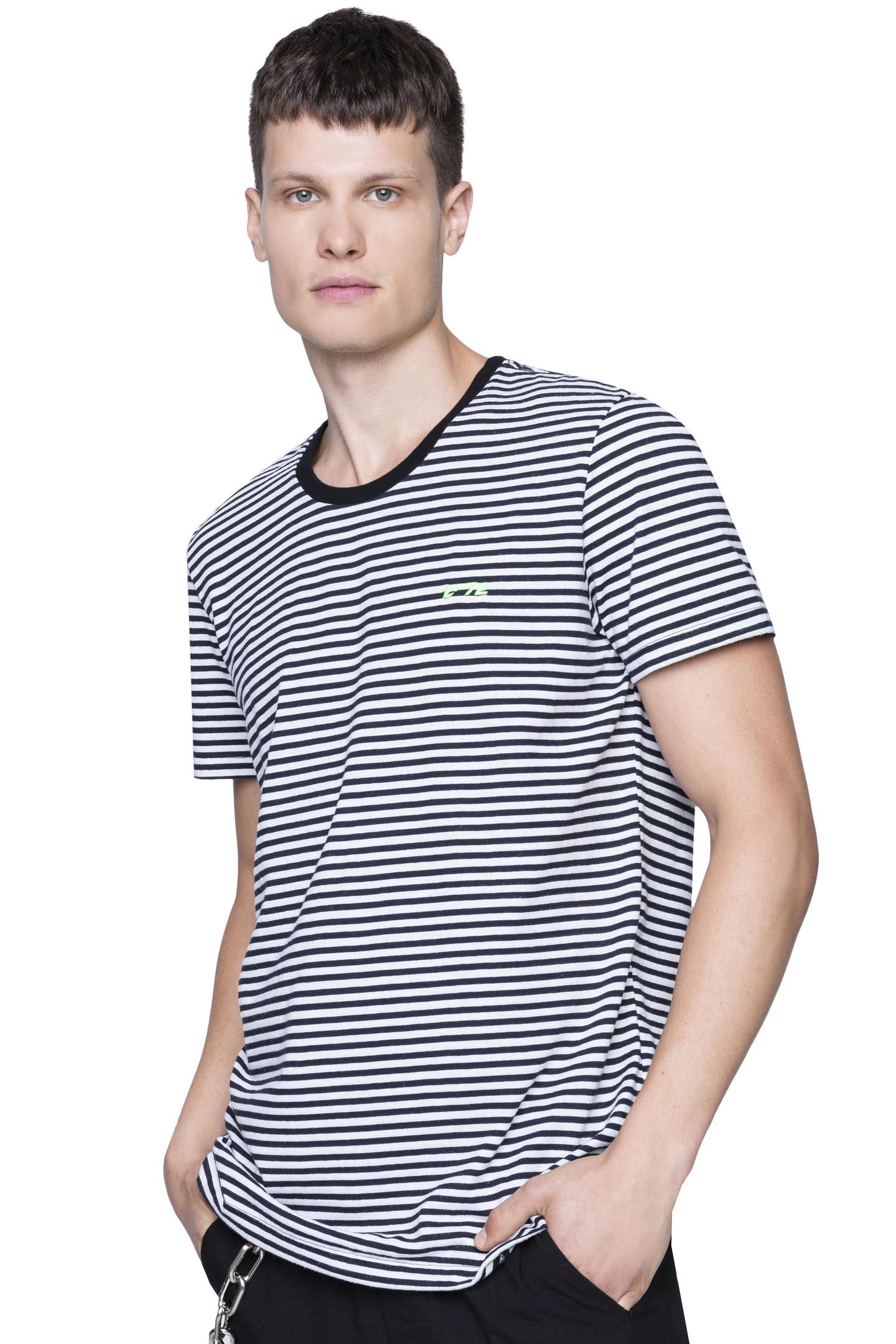 A t-shirt com estampa listrada é confeccionada em algodão. A peça possui caimento reto, gola redonda, mangas curtas e acabamentos canelados e pespontados.