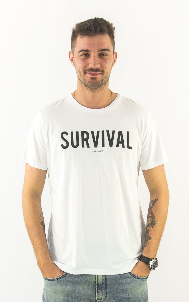 Ellus, em tecido 100% algodão pima, gola redonda, estampa frontal e modelagem básica