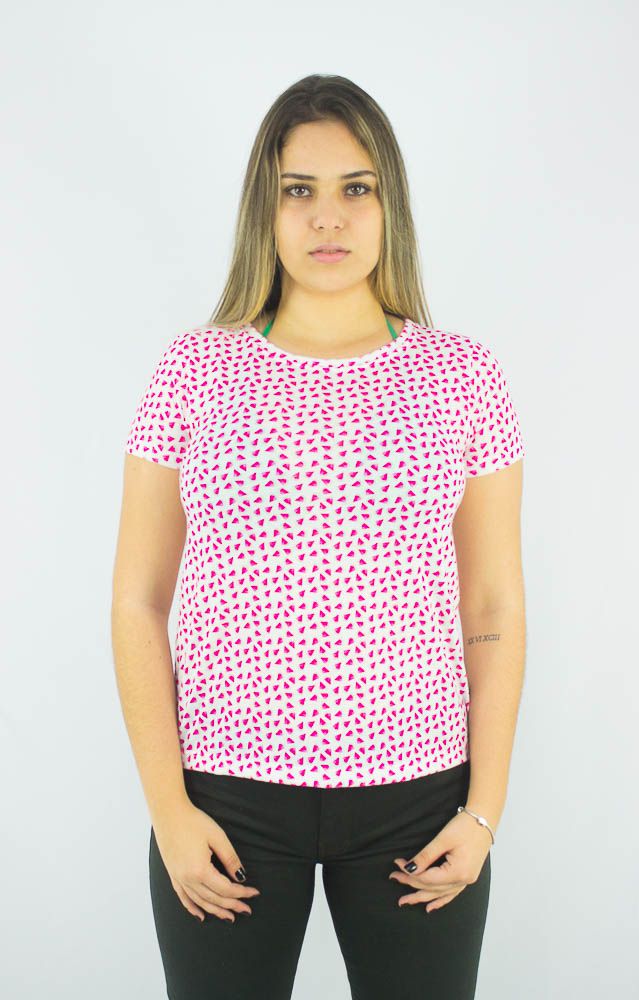 Detalhes da peça: Um padrão leve e tropical de melancias faz desta camiseta uma peça divertida e casual, ótima para usar com um short, saia ou jeans.