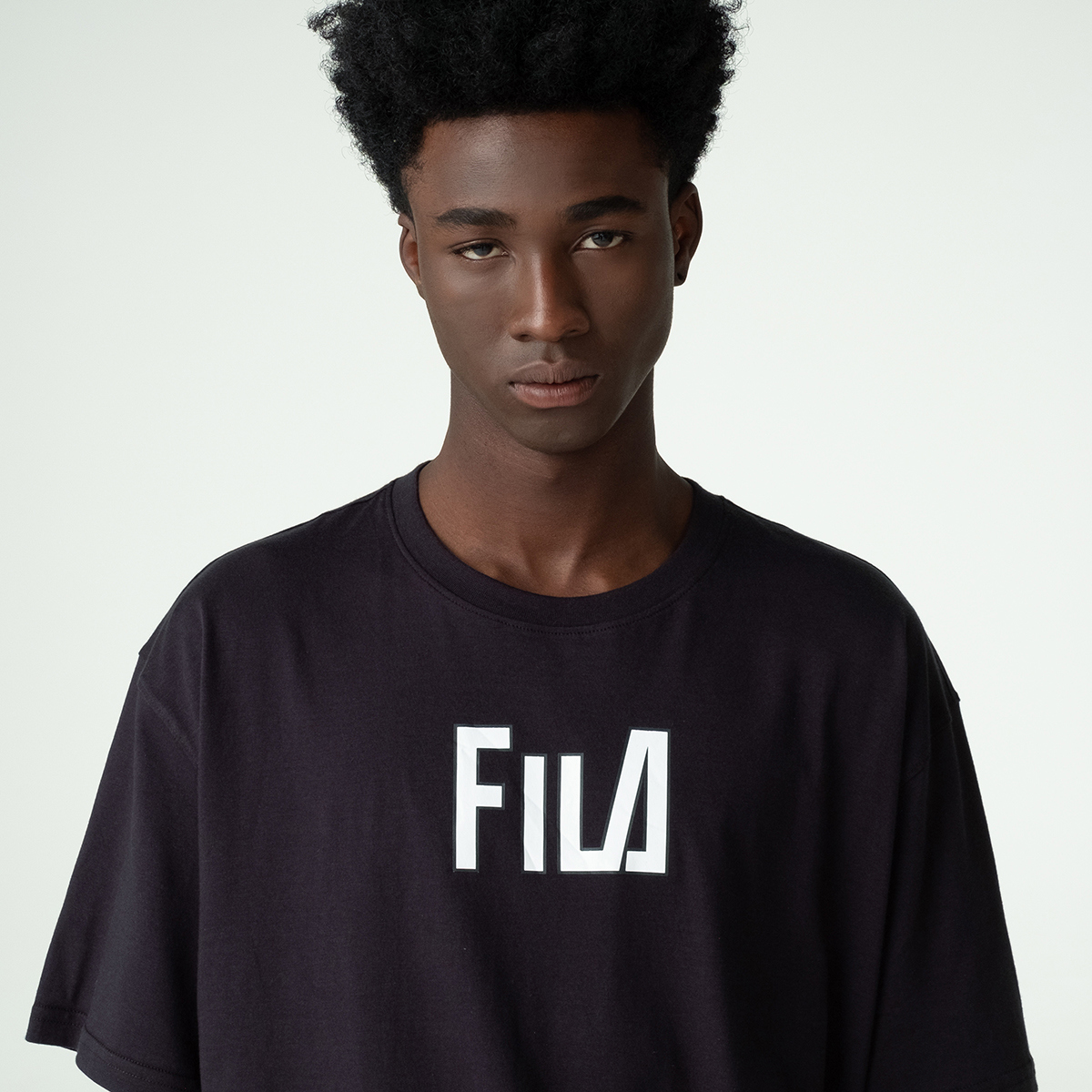 Camiseta masculina confeccionada em mix de tecidos com meia malha premium de algodão e recortes laterais em malha telada. Modelagem oversized com manga curta e gola careca em ribana. Possui cavas, ombros, barra e gola com acabamento pespontado, recorte lateral contrastante, estampa frontal Fila Letter Street Hop em silk sustentável e etiqueta Fila Street Hop aplicada na lateral esquerda próxima à barra. PRETO,BRANCO