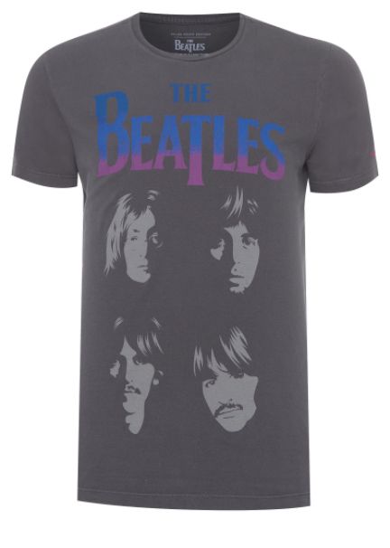 A t-shirt cinza chumbo é confeccionada em malha de algodão com toque macio, possui modelagem ajustada, estampa localizada das faces dos integrantes do "The Beatles", gola careca e mangas curtas.