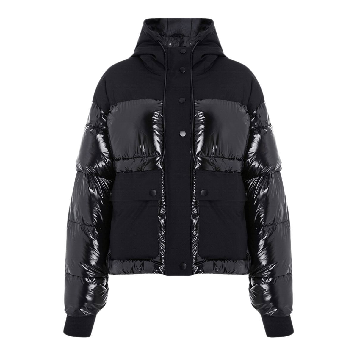 Confeccionada em material sintético, trabalhando o couro fake e nylon, a Jaqueta possui modelagem Puffer, mangas longas, bolsos frontais com botões de pressão, punho com elástico, touca ampla, aviamentos personalizados e fechamento frontal.