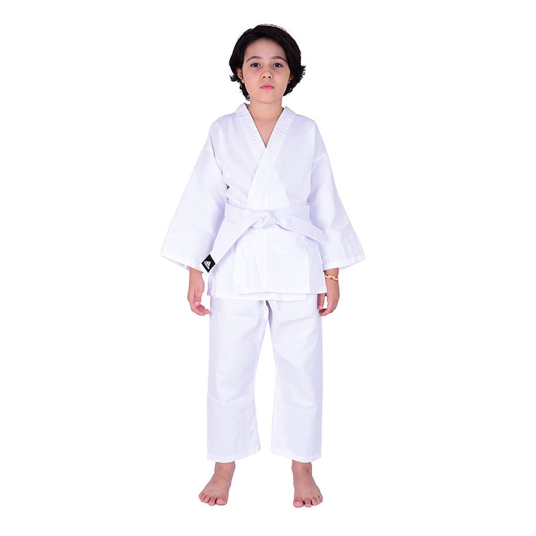 Uniforme leve e confortável de karate projetado para iniciantes de todas as idades, Composição da Jaqueta e Calça: Misto 60% algodão e 40% poliéster com 190grs m2 podendo variar +/- 5 grs, Calça com elástico na cintura e cordão para apertar, acompanha faixa branca