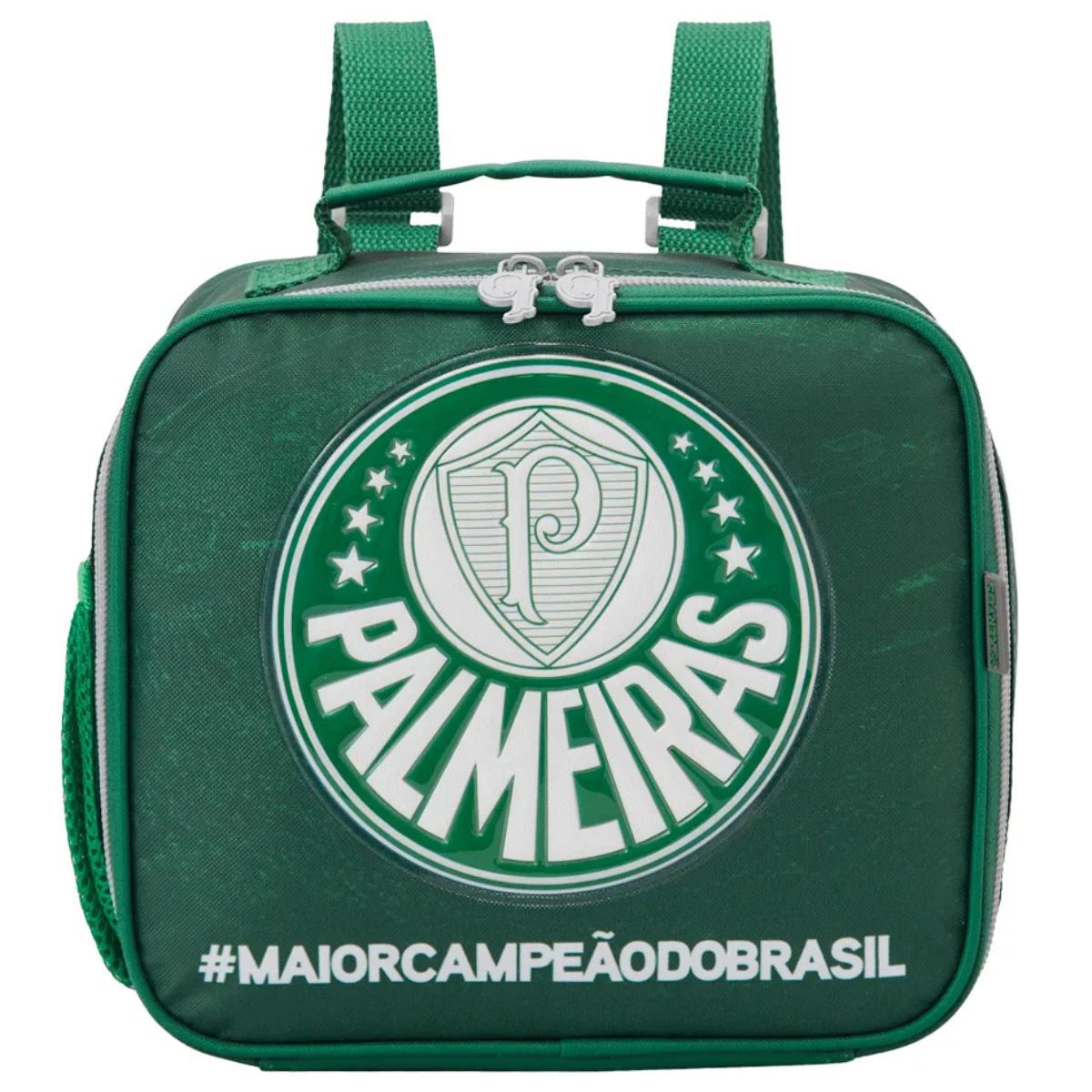 A hora do lanche nunca foi tão divertida com a lancheira do Palmeiras! Feita especialmente para os pequenos torcedores, essa lancheira possui forro PEVA térmico que mantém os alimentos frescos por mais tempo e um bolso lateral prático para pequenos itens. Com o escudo do time em PVC patch na frente, seu filho vai adorar levar seu lanche para a escola com o orgulho Palmeirense em destaque.