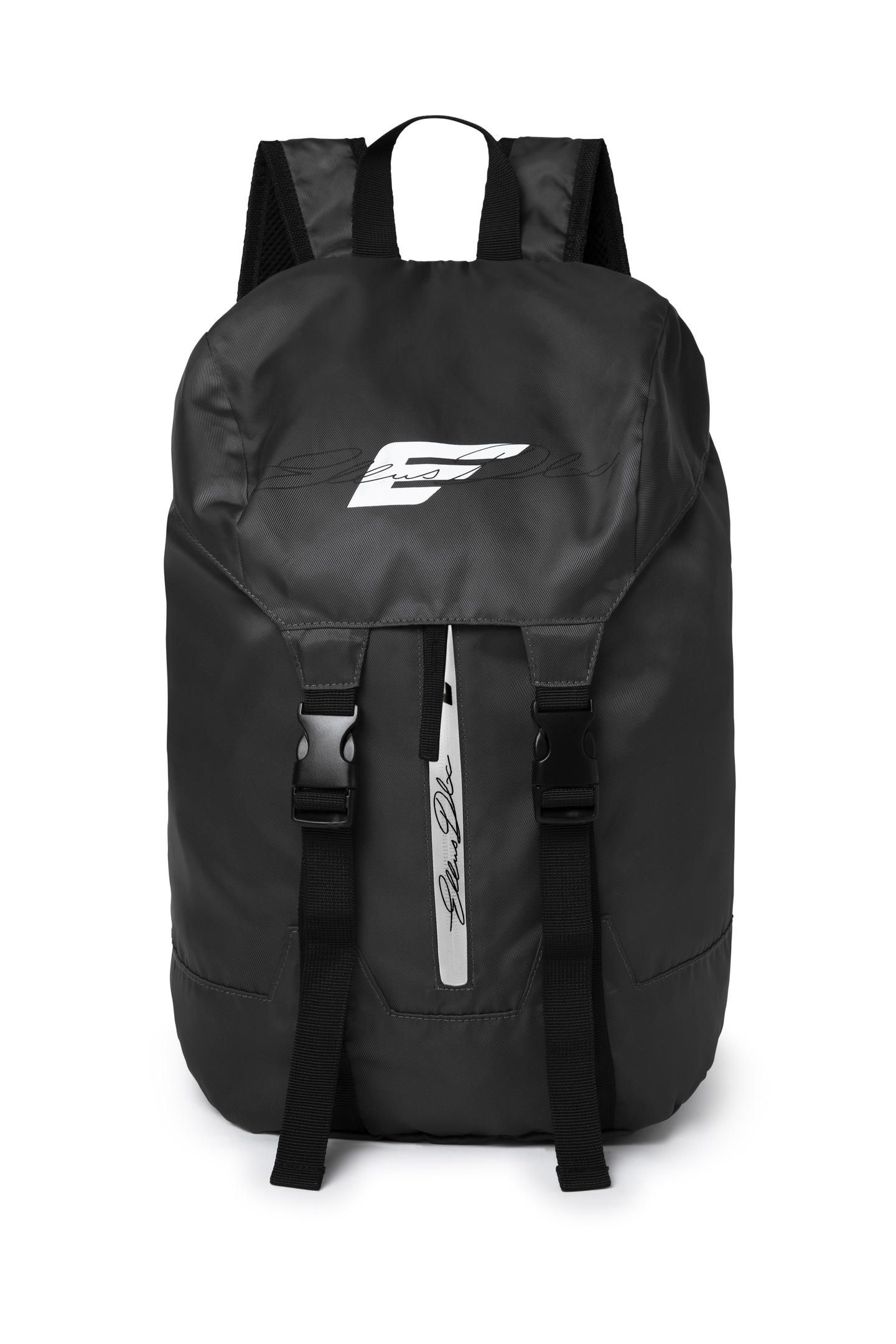A mochila é produzida em nylon. A peça de modelo backpack possui alça de mão fixa, alças posteriores ajustáveis, fechamento por amarração com cordão ajustável e fecho por encaixe e bolso externo com fechamento por zíper.