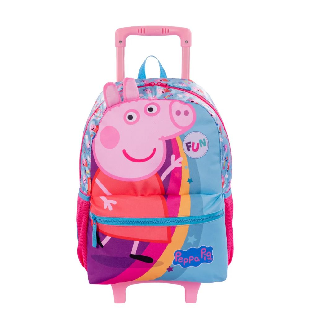 Esta Mochila conta com as aventuras da porquinha mais amada das telinhas! Produzida em um resistente poliéster, a estampa Peppa Pig traz elementos divertidos e orelhinhas 3D. O compartimento é espaçoso, o bolso frontal é ideal para guardar pequenos objetos, e você ainda pode levar sua garrafinha nos bolsos laterais. A opção com carrinho e rodinhas deixa o transporte mais leve e fácil, evitando esforços.