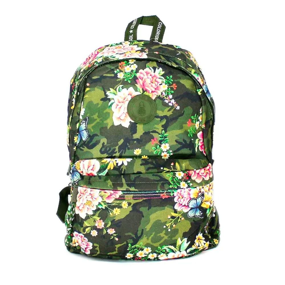 Mochila da marca Farm, confeccionada em tecido estampado. Possui alças reguláveis, bolso externo na frente e fechamento em zíper.