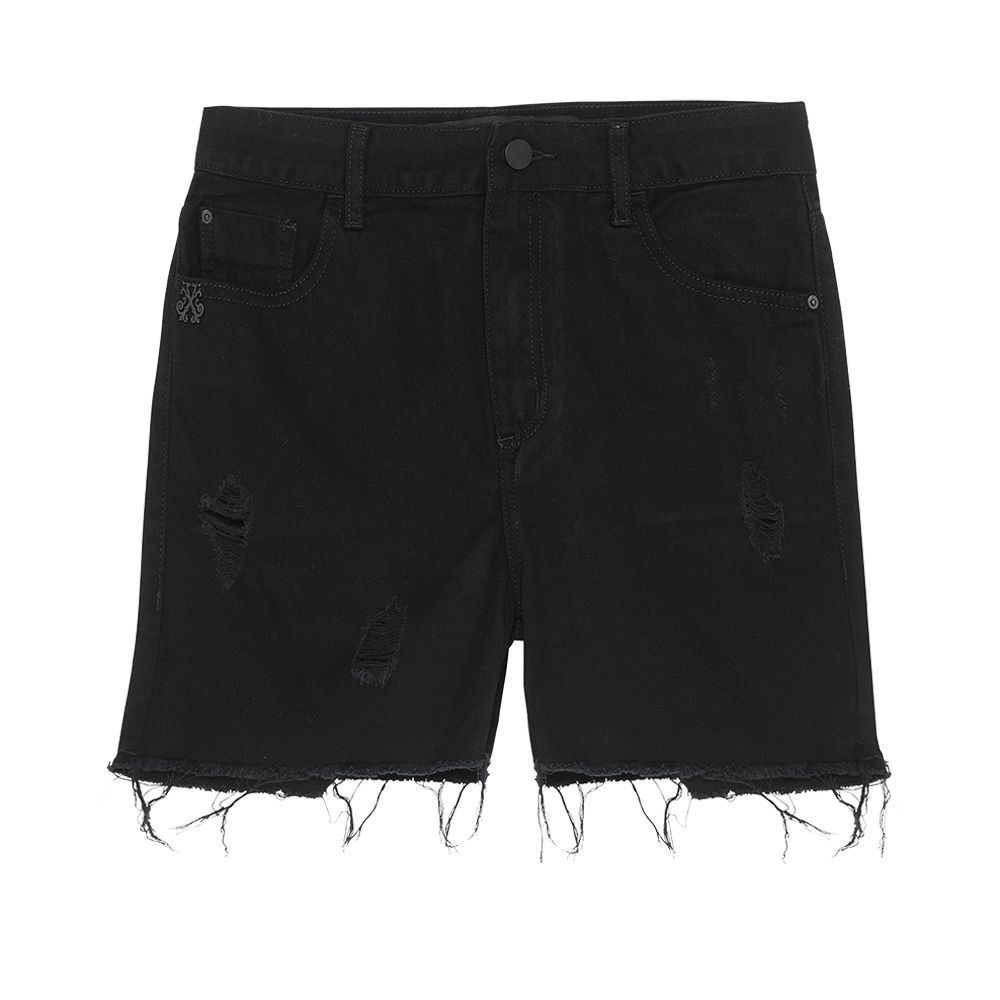 Confeccionada em sarja, a Bermuda possui modelagem reta, fechamento por zíper e botão frontal, cós com passantes, cinco bolsos, detalhes destroyed e puídos, barra desfiada e acabamento pespontado.