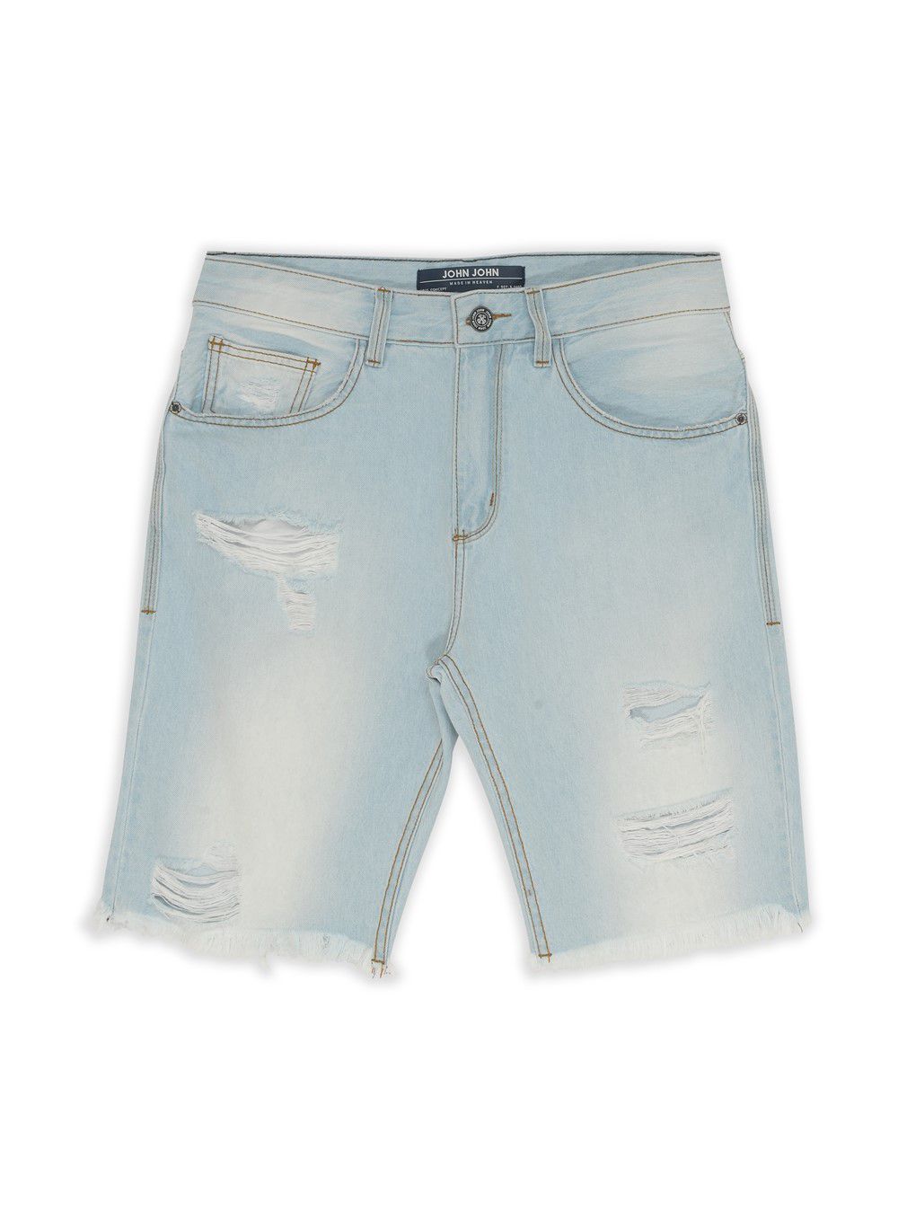 A Bermuda é confeccionada em jeans claro, possui caimento reto, cós com passantes aplicados e acabamento pespontado.