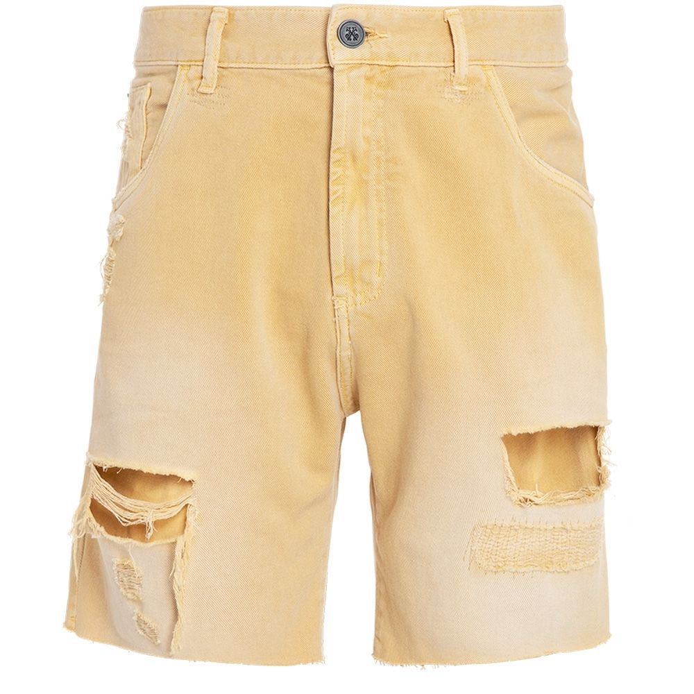 Confeccionada em sarja, a Bermuda, modelagem reta, cós com passantes, fechamento frontal por zíper e botão, bolsos frontais e posteriores, detalhes puídos com cerzidos e acabamento pespontado.