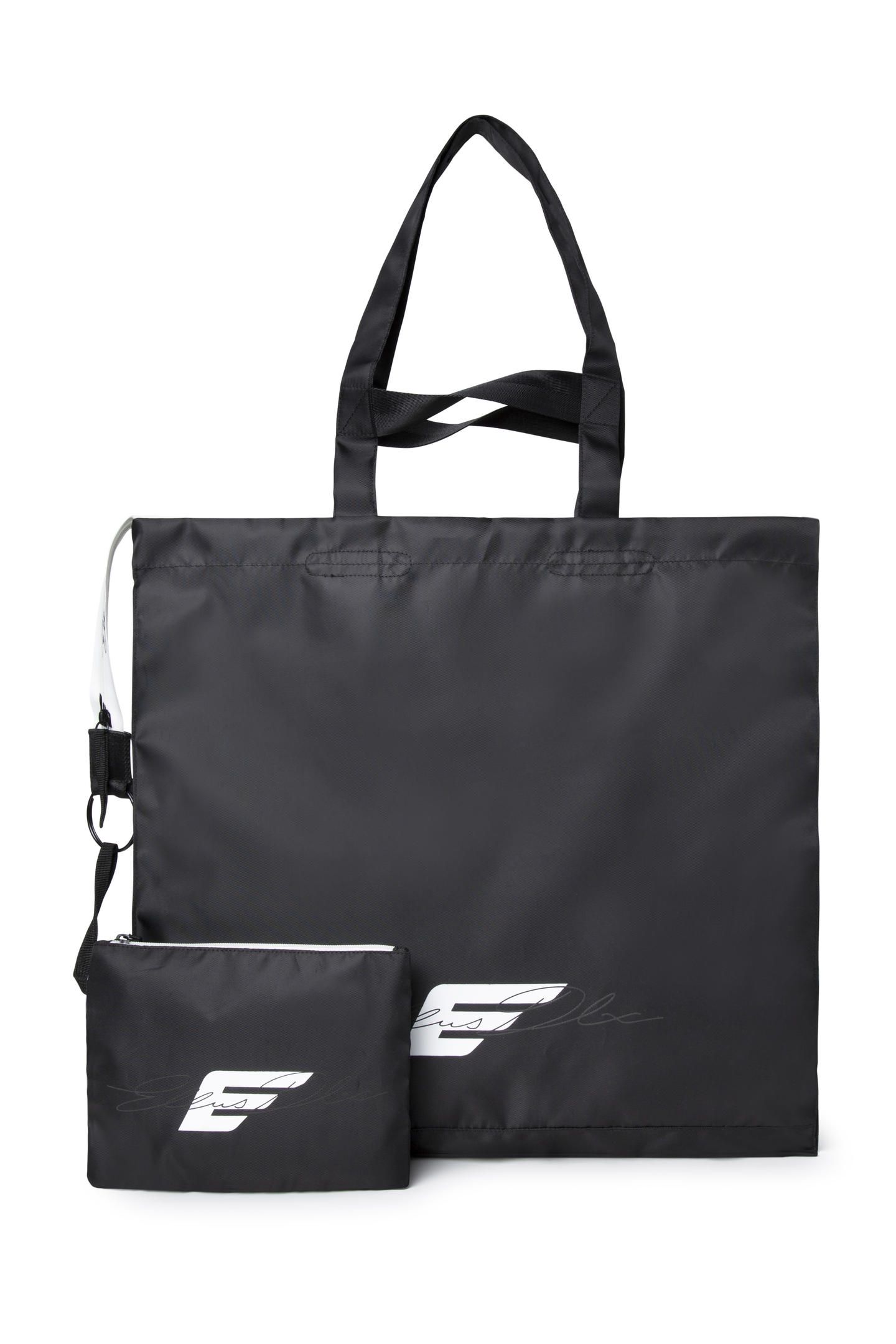 A bolsa é produzida em material tecnológico. A peça modelo shopping bag possui duas alças fixas, fechamento por zíper estampado, acompanha bolsa pequena e acabamentos pespontados.
