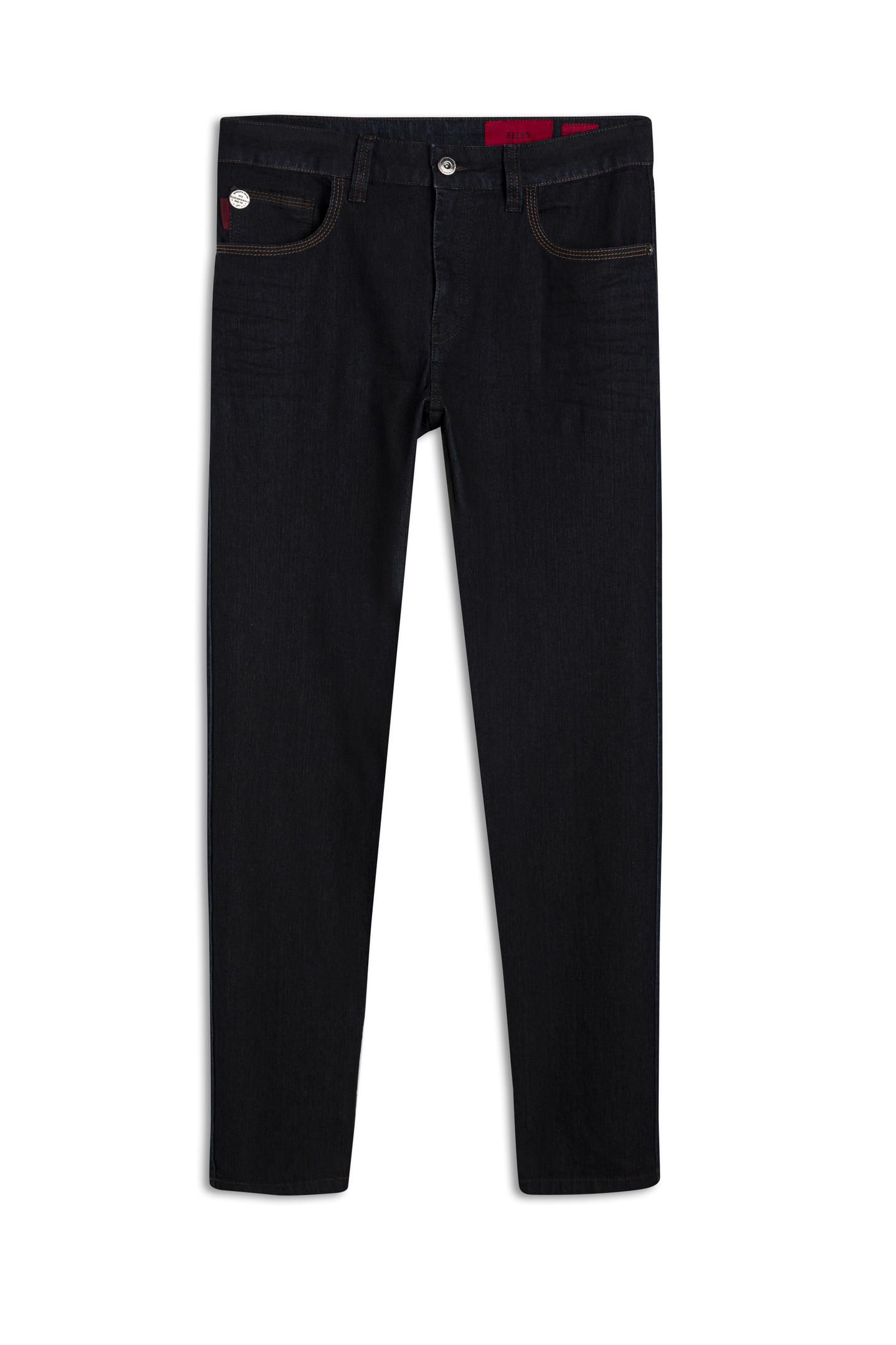 Modelagem slim na cor preto e costuras em marrom, calça super confortável para quem curte um caimento mais tradicional