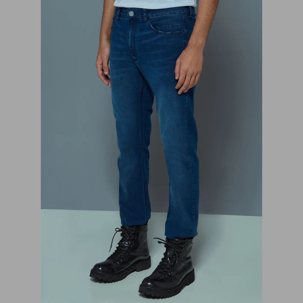 Confeccionada em jeans com lavagem médio, a calça possui cós com passantes, fechamento frontal por zíper e botão, bolsos frontais e posteriores, modelagem slim e acabamento pespontado.