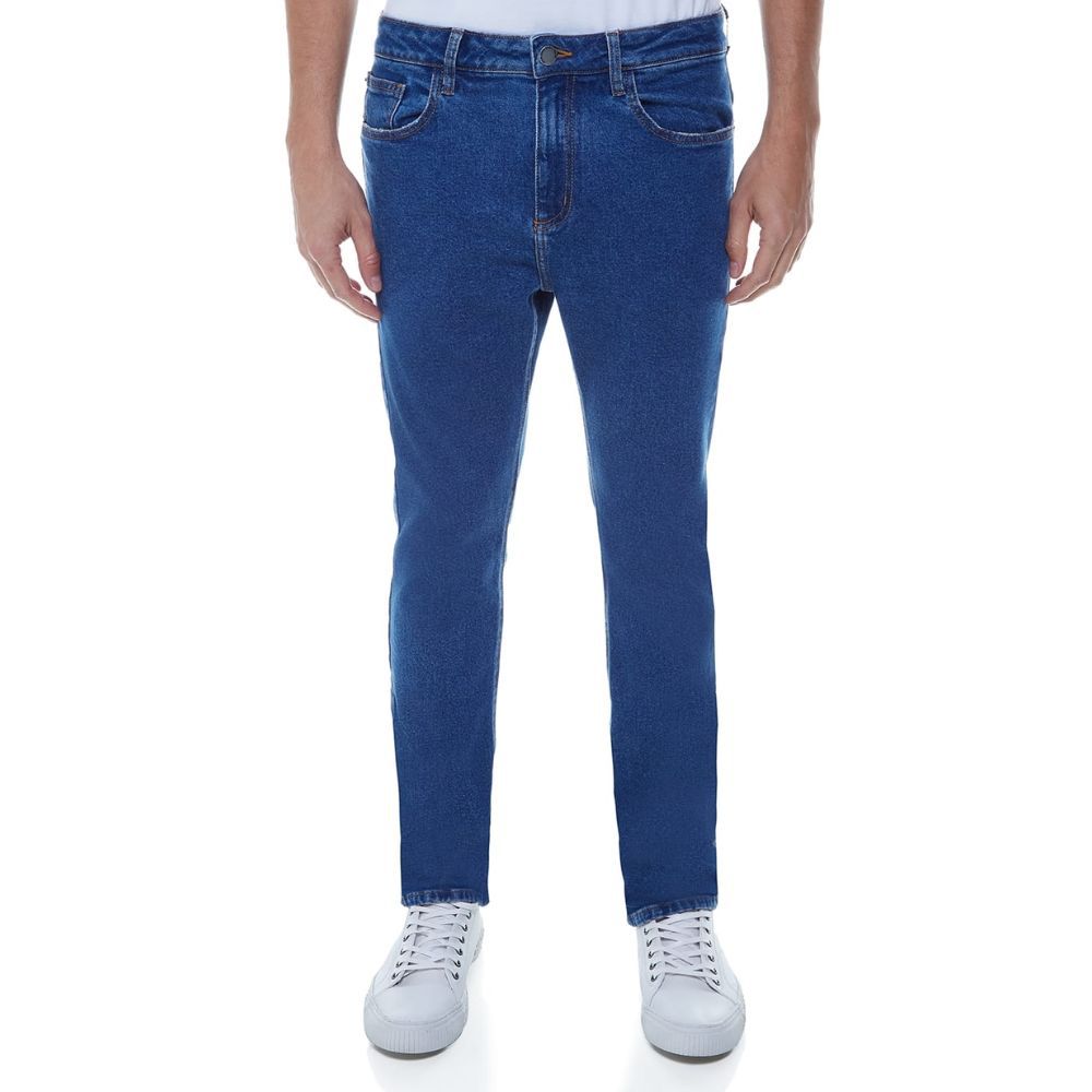 Confeccionada em jeans com lavagem média, a Calça possui modelagem slim, cós com passantes, fechamento frontal por zíper e botão, cinco bolsos e acabamento pespontado.