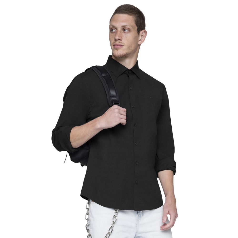 A camisa é confeccionada em tricoline. A peça de modelagem slim possui colarinho curto, mangas longas com abotoamento nos punhos, logo da marca bordado na altura do tórax e fechamento frontal por botão.