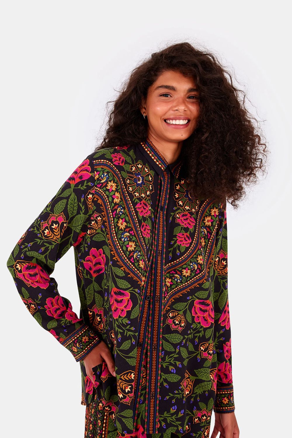 camisa de botão com estampa localizada e mangas longas. modelagem com gola, patê e punho com abotuaduras e detalhe de pala nas costas. a coleção refloresta é carbono neutro, é roupa mais responsável. é mil árvores por dia, todos os dias.