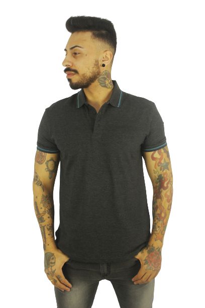 CAMISA POLO ELLUS PIQUET INDUSTRY CINZA FRISO AZUL