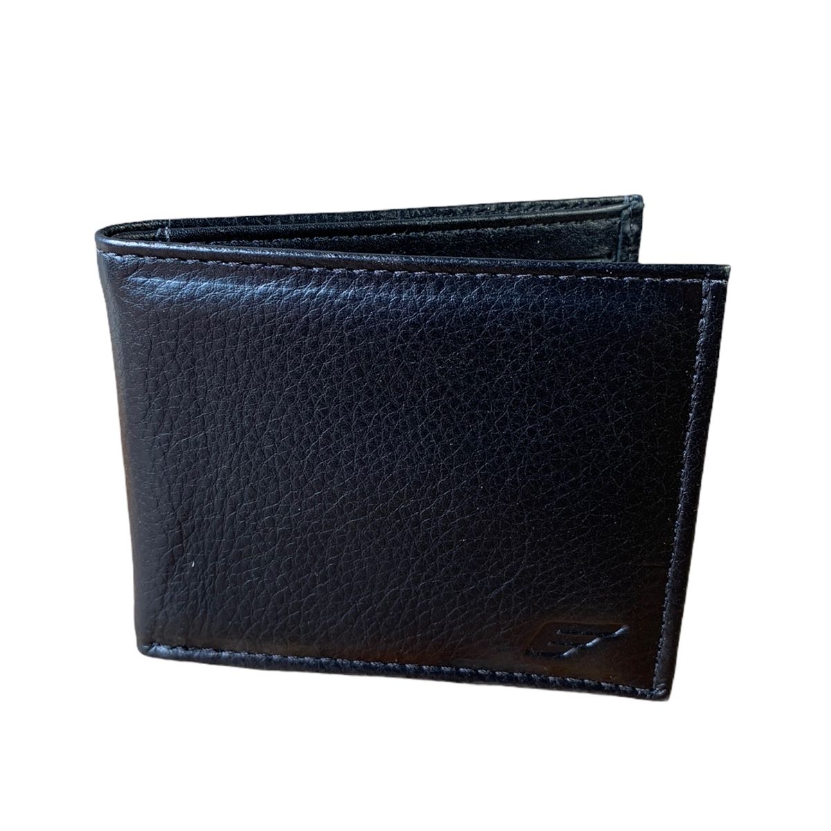 A carteira preto é produzida em couro. A peça possui formato retangular, compartimento interno, seis divisórias para cartões, tag com nome da marca aplicada na parte frontal e acabamento pespontado.
