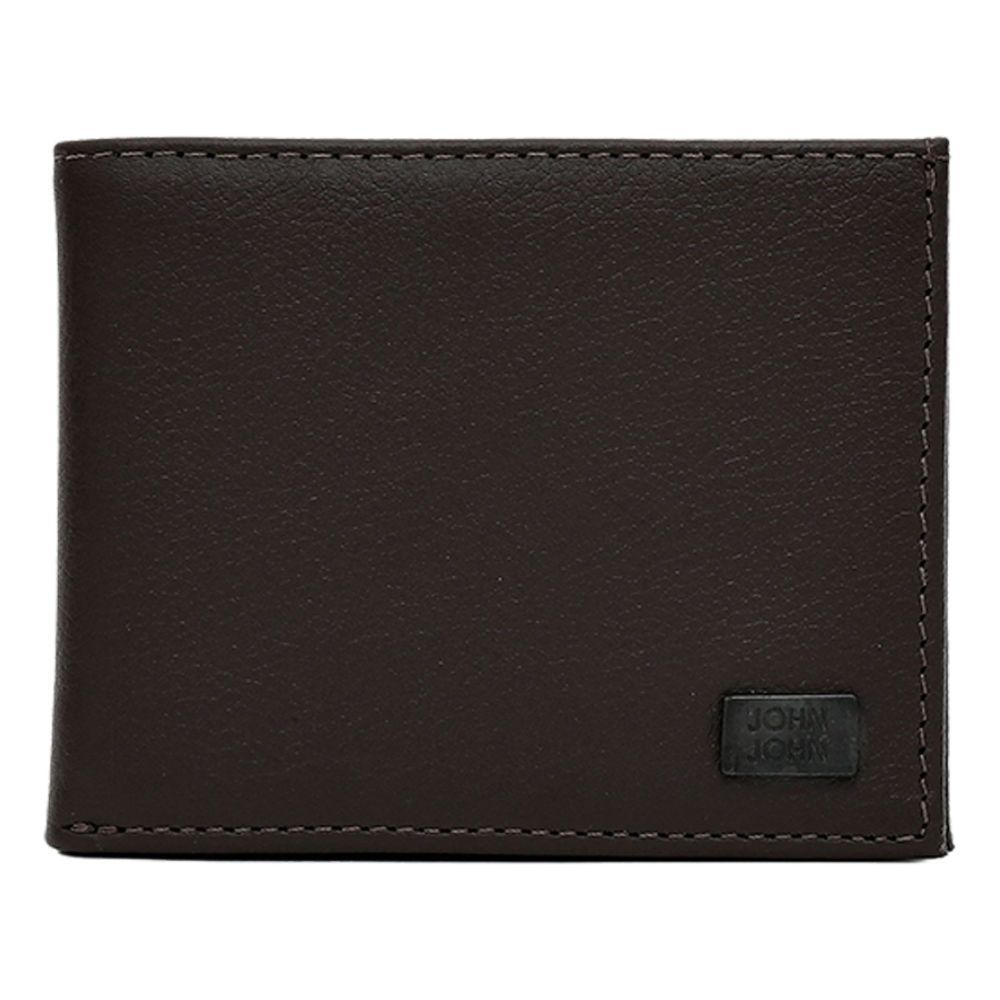 A Carteira é fabricada em couro, possui formato retangular, detalhe frontal de logo aplicada, compartimentos internos e acabamento pespontado.