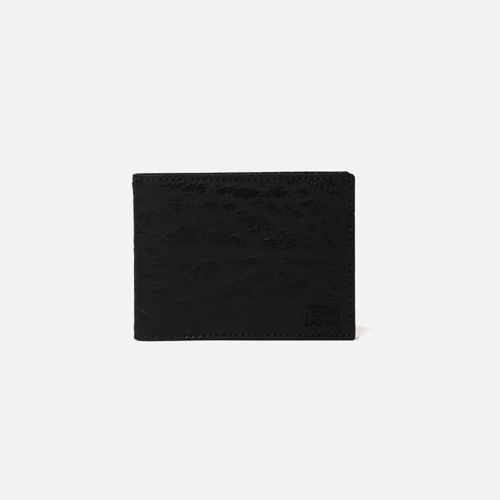 A Carteira é fabricada em couro, possui formato retangular, detalhe frontal de logo aplicada, compartimentos internos e acabamento pespontado.