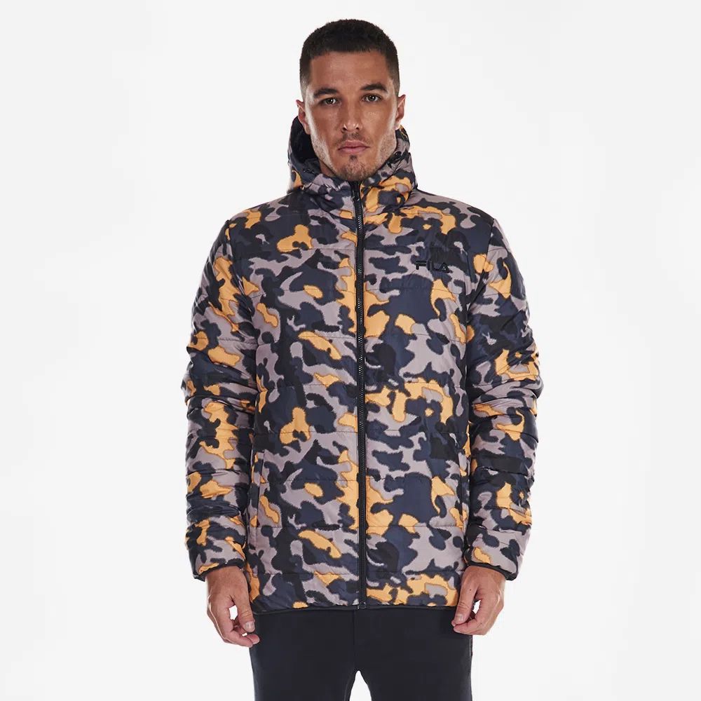 Jaqueta casual dupla face com isolamento para proporcionar aquecimento nos dias frios. Uma face possui gráfico Fila camuflado e Patch emborrachada losango Fila Letter no peito, outra face é lisa também com Patch emborrachado losango Fila Letter no peito. Possui enchimento, capuz com elástico e ajuste e zíper frontal com puxador personalizado. Acabamento matelassê horizontal.