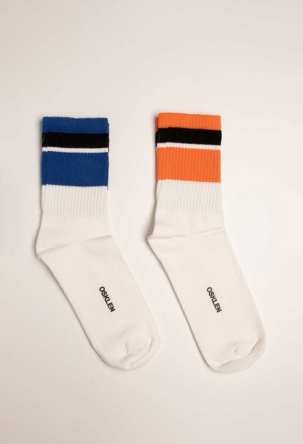 Kit com 2 pares de meias cano médio Osklen nas cores branco com detalhes em azul e laranja