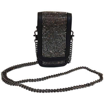 A Bolsa é confeccionada em material sintético com taxas metálicas aplicadas, possui formato retângular, alça regulável por fivela metálica, compartimento principal com fechamento por botão de pressão e acabamento pespontado.
