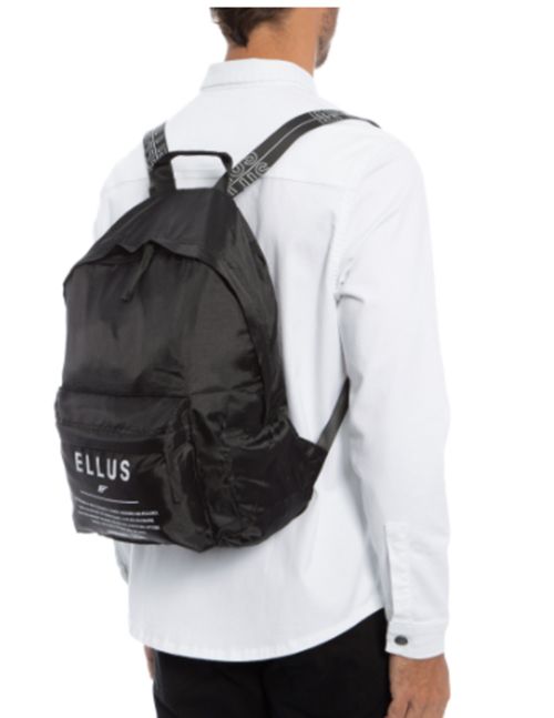 A mochila é produzida em poliester. A peça de modelo backpack possui alça de mão fixa, alças posteriores ajustáveis, fechamento por zíper, com cordão ajustável e fecho por encaixe e bolso externo com fechamento por zíper.