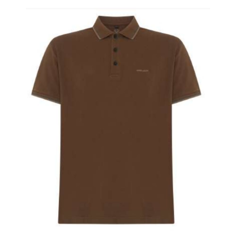 Confeccionada em malha, a Polo possui modelagem reta, gola clássica, fechamento frontal com vista interrompida por botões, mangas curtas, detalhe de recorte bicolor, bordado com inscrição da marca e acabamento canelado.