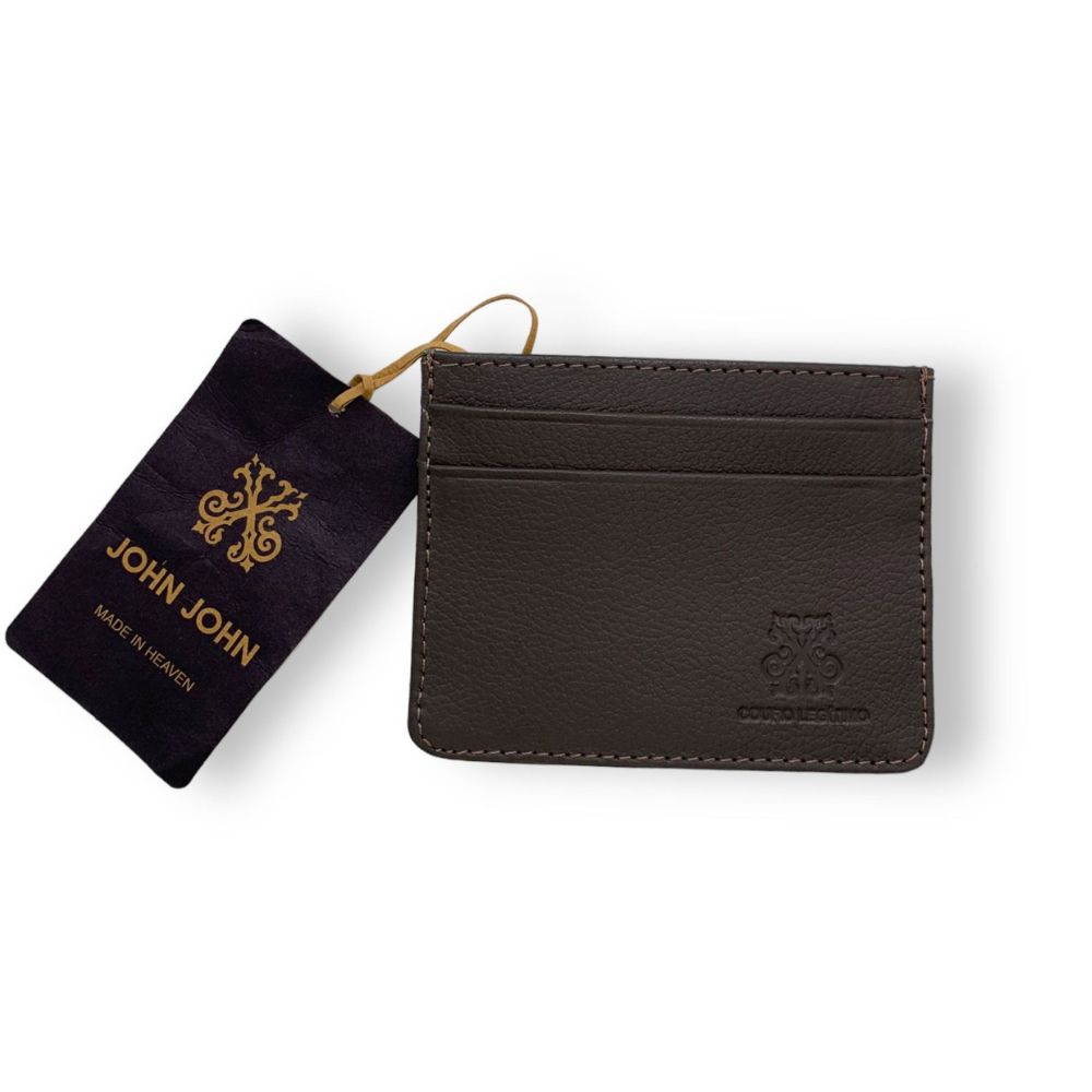 A Carteira é fabricada em couro, possui formato retangular, detalhe frontal de logo aplicado, compartimentos internos e acabamento pespontado.