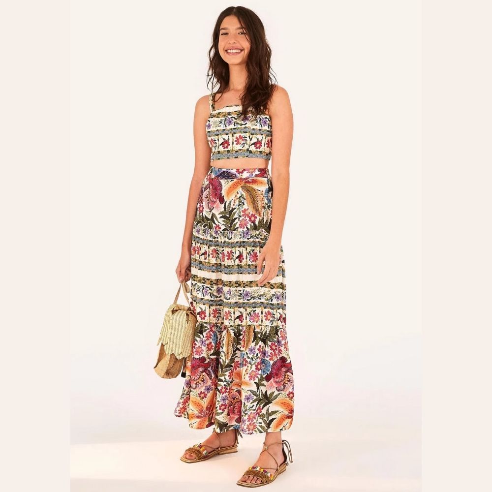 Saia cropped estampada bordadeira. possui cós de elástico nas costas e saia ampla com recorte em camadas franzidas.