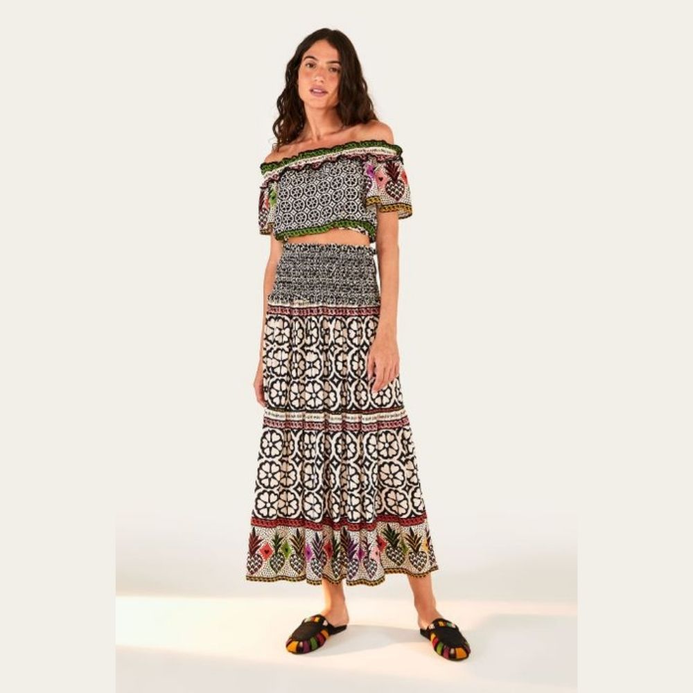 Saia longa com cós todo em lastex e acabamento de babadinho na ponta. Modelo com babados em camadas ao longo.