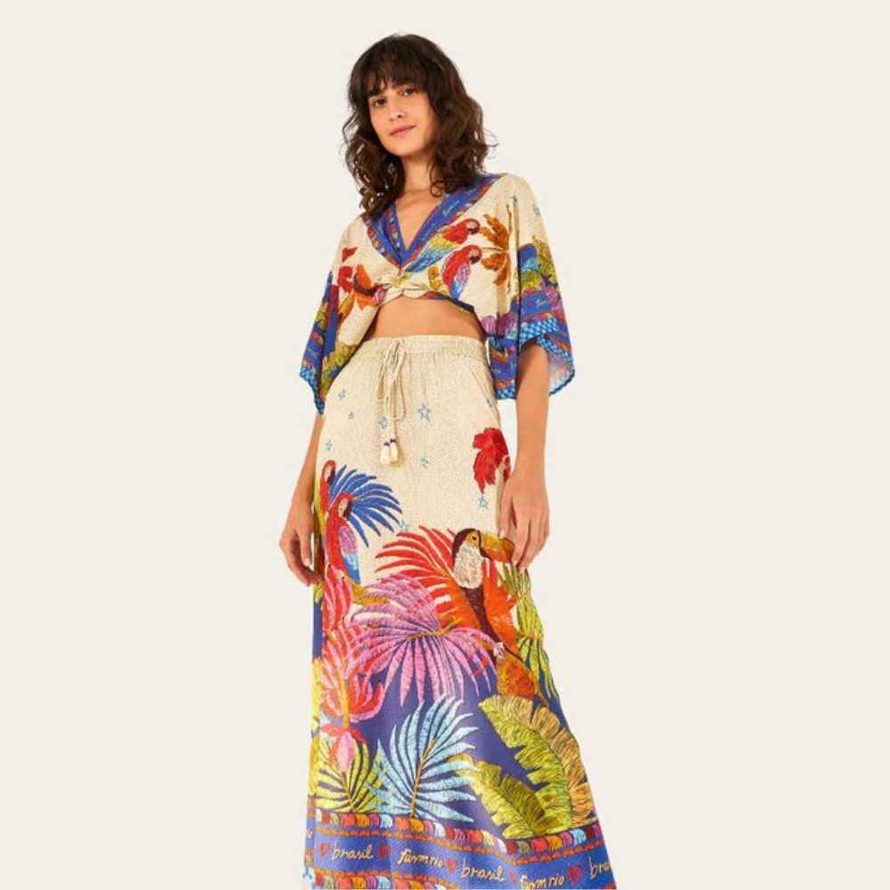 Saia midi estampada com cós de elástico largo. possui rolotê embutido no cós finalizado com ponteiras de tasssel de linha. modelo godê finalizada com bainha fina.