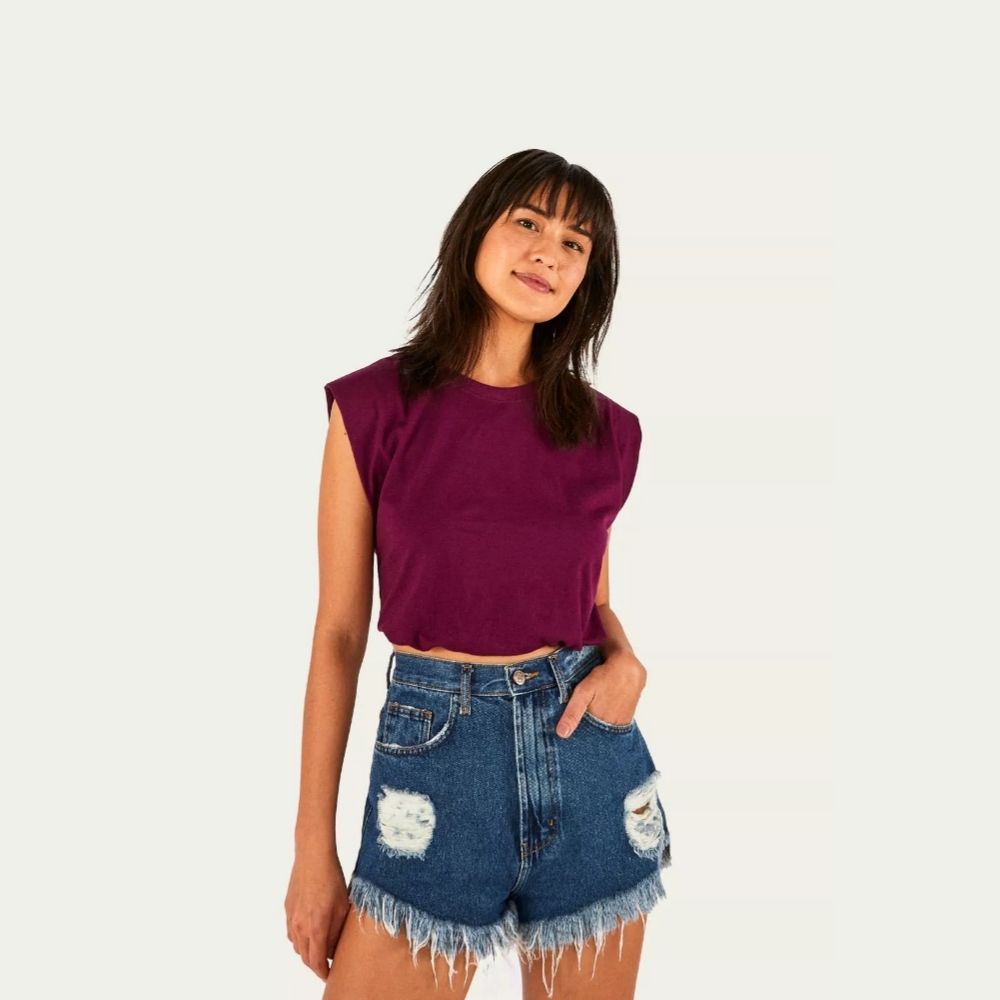 Short re-farm jeans degrau cintura baixa. Possui cós reto com passadores frente e costas. abertura frontal com um botão de metal flex caseado. Bolsos arredondados nas laterais e dois bolsos chapados nas costas. Tem detalhe desgastado no jeans, na parte da frente e nas costas. possui corte na diagonal e bainha desfiada finalizando a barra.