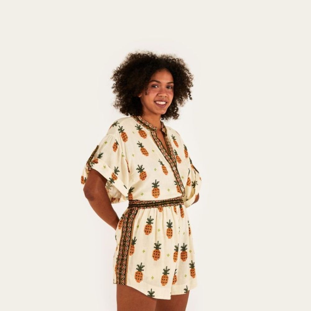 Short estampado com cós de elástico largo na frente e nas costas. Modelo soltinho finalizado com bainha larga.