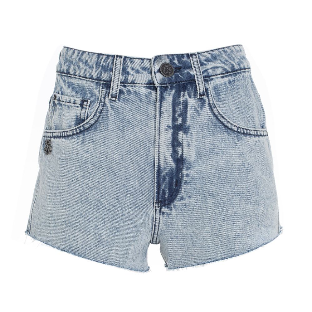 Confeccionado em jeans, o shorts possui modelagem boyfriend, cós com passantes, fechamento frontal por zíper e botão, bolsos frontais e posteriores, barra dobrada duas vezes e desfiada.