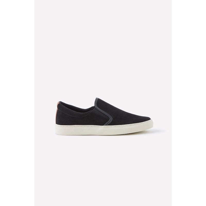 CONFECCIONADO EM COURO NOBUCK, TÊNIS SLIP ON FOXTON PRETO, SOLADO DE BORRACHA.