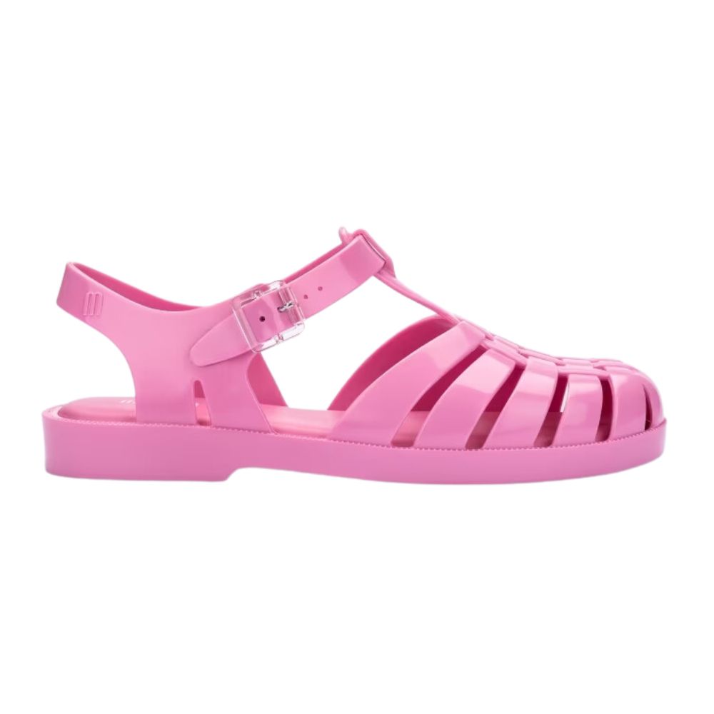 Sandália Melissa Possession rosa fabricada em plástico PVC Melflex®️. Possui bico arredondado e cabedal arranhado (com tiras que se entrelaçam). A tira que envolve o calcanhar possui fechamento em fivela, para melhor ajuste ao pé. A palmilha é macia e conta com o logotipo da marca estampado.