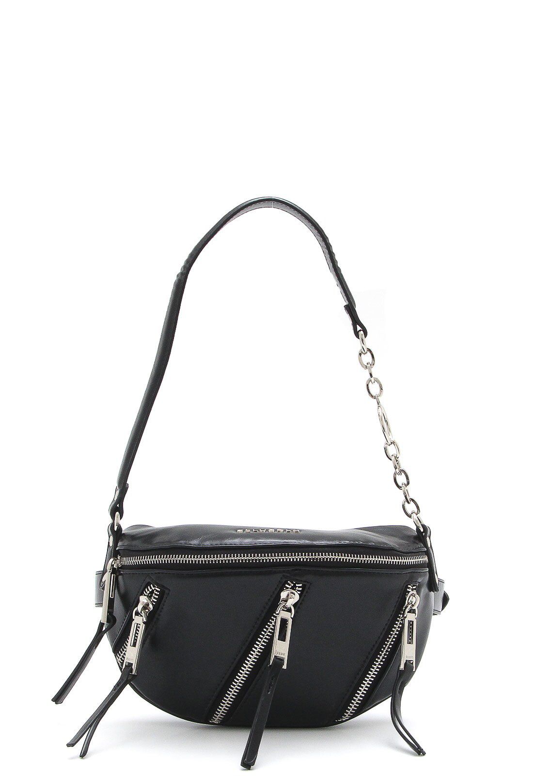 A bolsa é produzida em material tecnológico. A peça modelo pochete possui alça em corrente com recorte, fechamento por zíper, acompanha cinto removível com furos e passantes para ajuste e zíperes frontais decorativos.