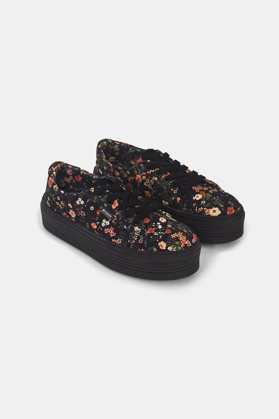 O TÊNIS PRETO É PRODUZIDO EM LONA. A PEÇA DE MODELO FLATFORM POSSUI BICO ARREDONDADO, ESTAMPA FLORAL, DETALHE DE LISTRA APLICADA NA PARTE PORTERIOR NA COR VERDE, TAG DA MARCA APLICADA, SOLADO EMBORRACHADO E TEXTURIZADO, PALMILHA ACOLCHOADO, ACABAMENTO PESPONTADO E FECHAMENTO AJUSTÁVEL POR CADARÇO.